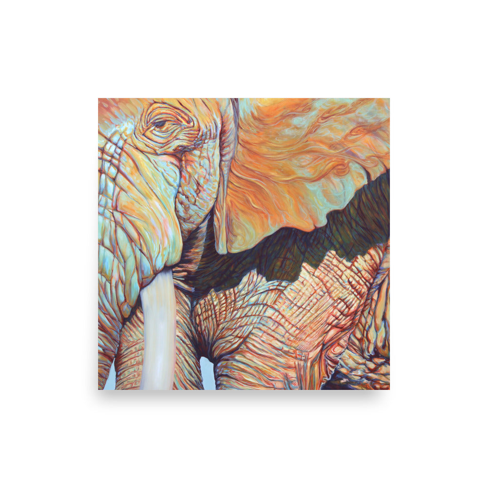Jupiter is a colorful close up of an African elephant. It is inspired by the colors and swirling shapes of the planet Jupiter. The elephant overflows the limits of the art to pay homage to the larger-than-life persona of Jupiter, the Greek god, that the planet is named after.