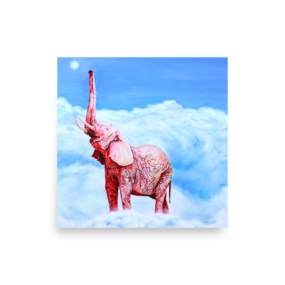 Venus rising is a cheerful pink elephant with her trunk raised. She's reaching for for a daytime star above her field of blue of white clouds.