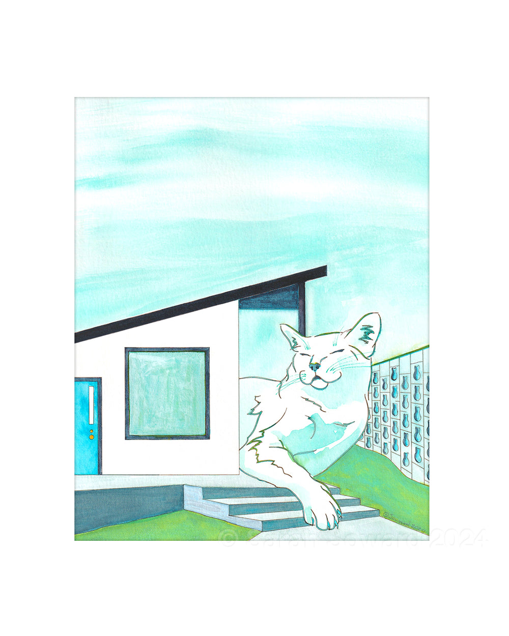Modern House Cats™ artwork features the cats of Frisky Business Cat Cafe, Palm Springs. These works incorporate clean Mid-Century architecture juxtaposed with oversized house cats as integral parts of the structure of the house. The goal is artful elegance with a nod toward fun.