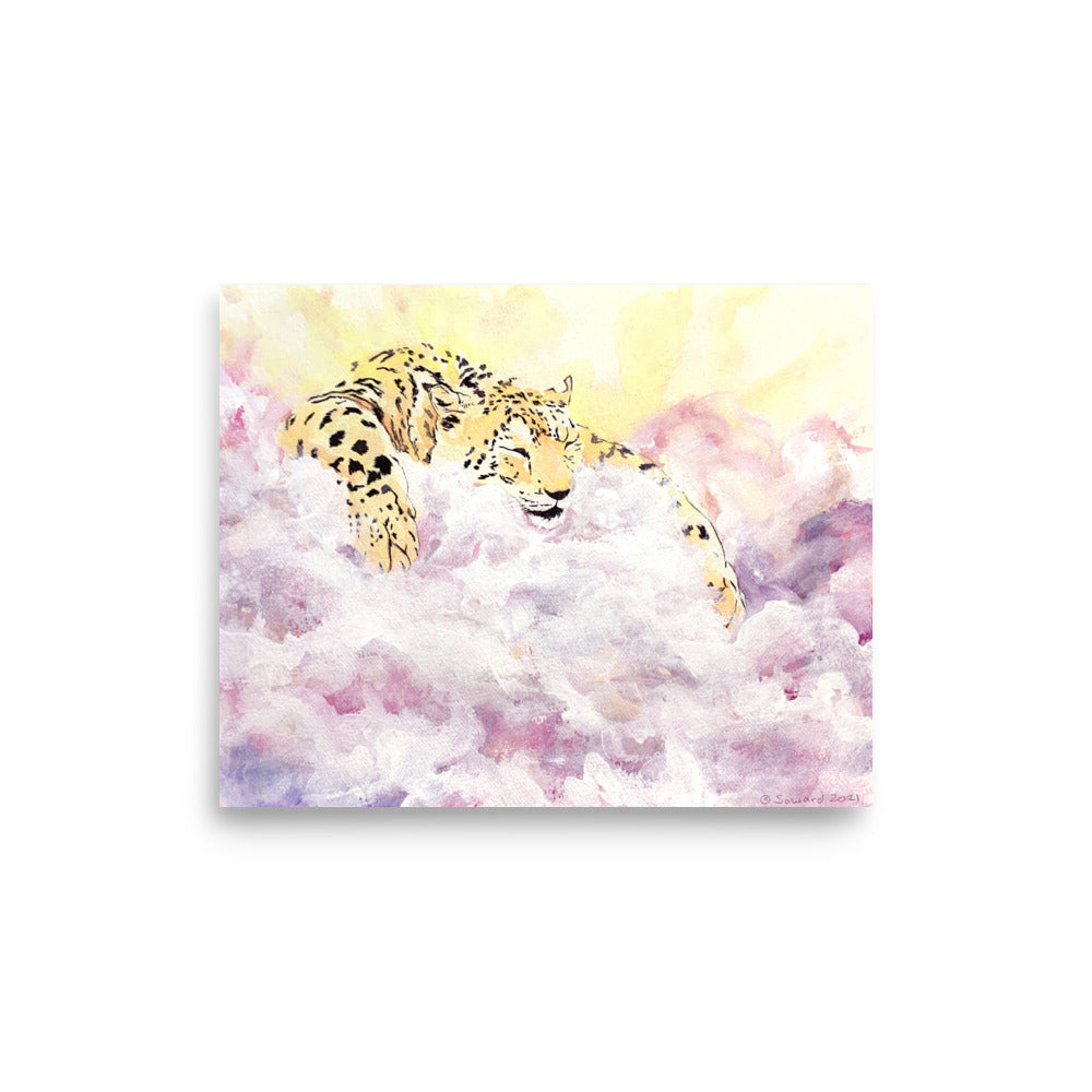 It's snow leopard asleep on a massive fluffy pile of clouds. The fun is not just glowing in the background, it's emanating from the snow leopard. That's what makes this spotted wild cat a sun leopard too.